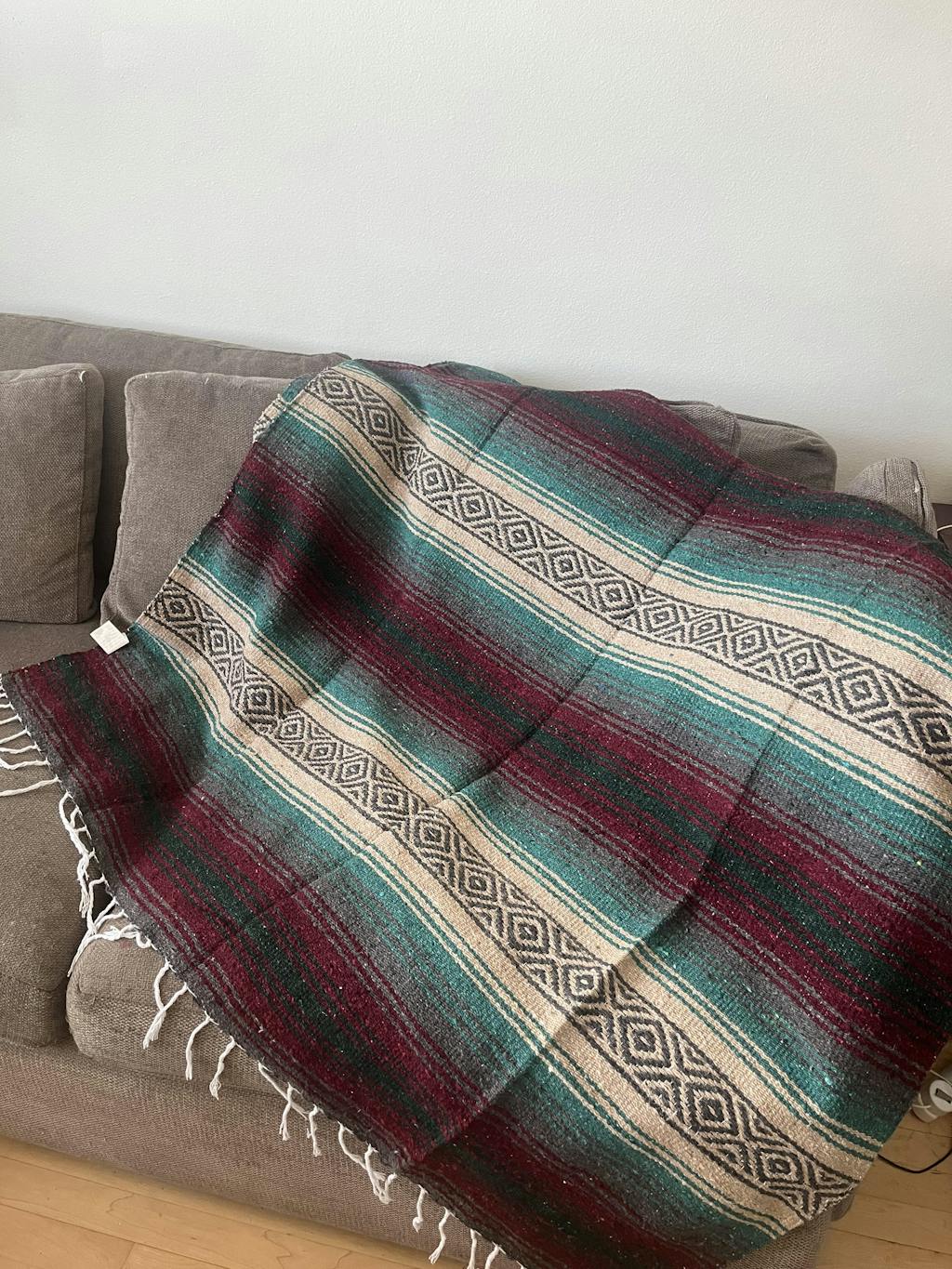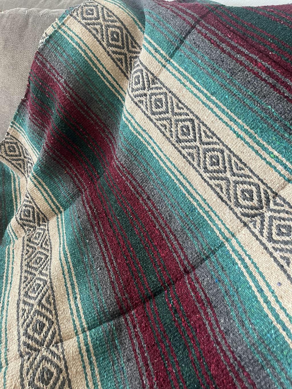 A falsa blanket is a traditional Mexican blanket known for its soft, breathable weave and earthy tones. It’s versatile and often used for yoga, meditation, or everyday comfort.